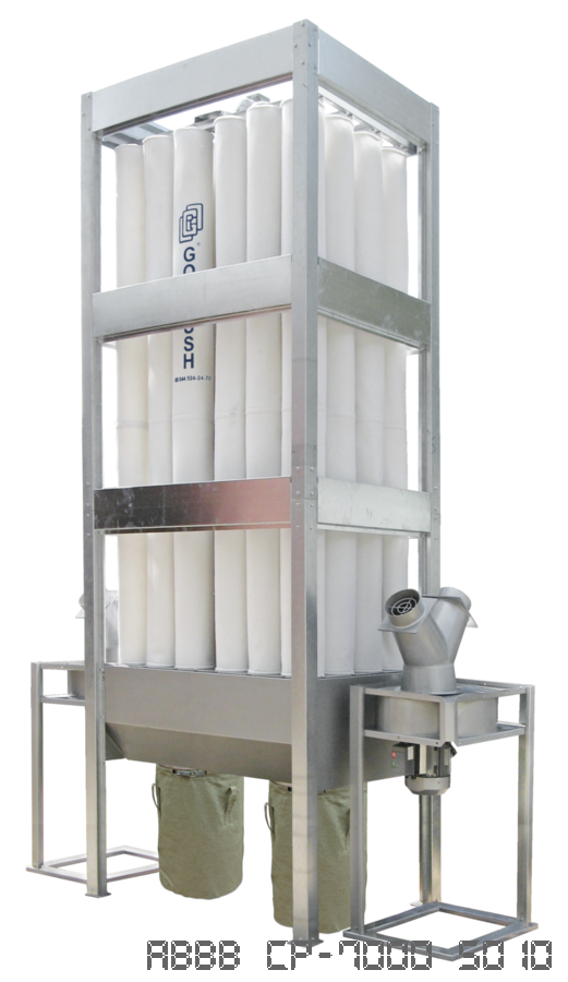 Аспирационная установка СР - 7000 (фильтры в виде рукавов из материала, соответствующего свойствам удаляемой пыли). Рукавные аспирационные установки средней производительности эксплуатируют в основном со шлифовальным оборудованием большой мощности. Специализация - отделение пыли, но они так же эффективно отделяют и стружку. Рукавные фильтра позволяют проводить регенерацию и периодическую очистку фильтровального блока, что обусловило развитие и широкое распространение рукавного фильтровального оборудования.