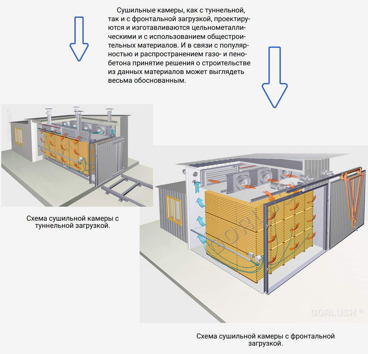 Сушильные камеры или комплексы, конструктивно отличающиеся (частично или полностью) от цельнометаллических сушильных камер, при строительстве которых были использованы кирпич, пеноблоки, древесина и другие строительные материалы, предлагаем называть сушильными камерами из строительных материалов.