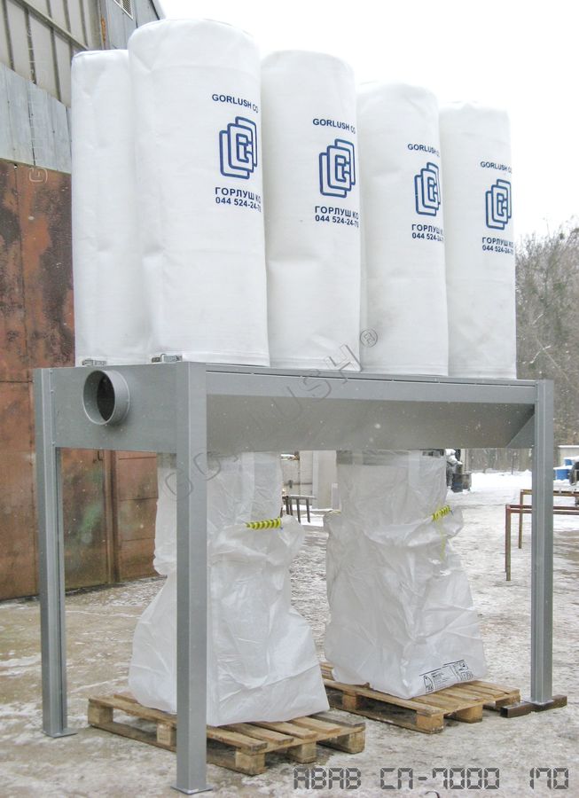 Аспирационная установка СР - 7000 (фильтры в виде рукавов из материала, соответствующего свойствам удаляемой пыли). Рукавные аспирационные установки средней производительности эксплуатируют в основном со шлифовальным оборудованием большой мощности. Специализация - отделение пыли, но они так же эффективно отделяют и стружку. Рукавные фильтра позволяют проводить регенерацию и периодическую очистку фильтровального блока, что обусловило развитие и широкое распространение рукавного фильтровального оборудования.