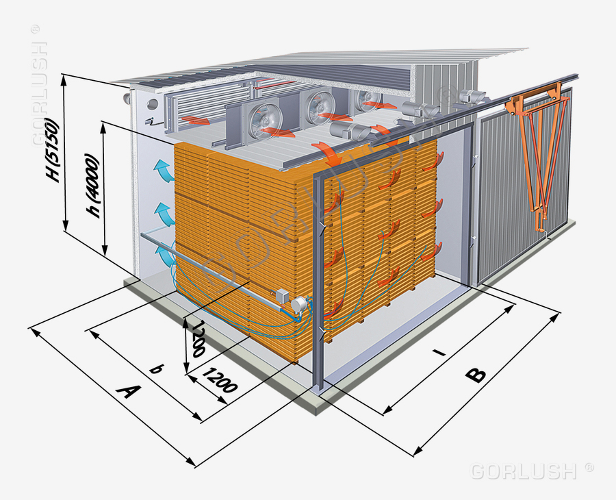 Данный размерный ряд габаритных размеров разработан, оптимизирован сотрудниками предприятия ГОРЛУШКО на основании более чем 20-и летней работы в области изготовления лесосушильных камер и оборудования для них.